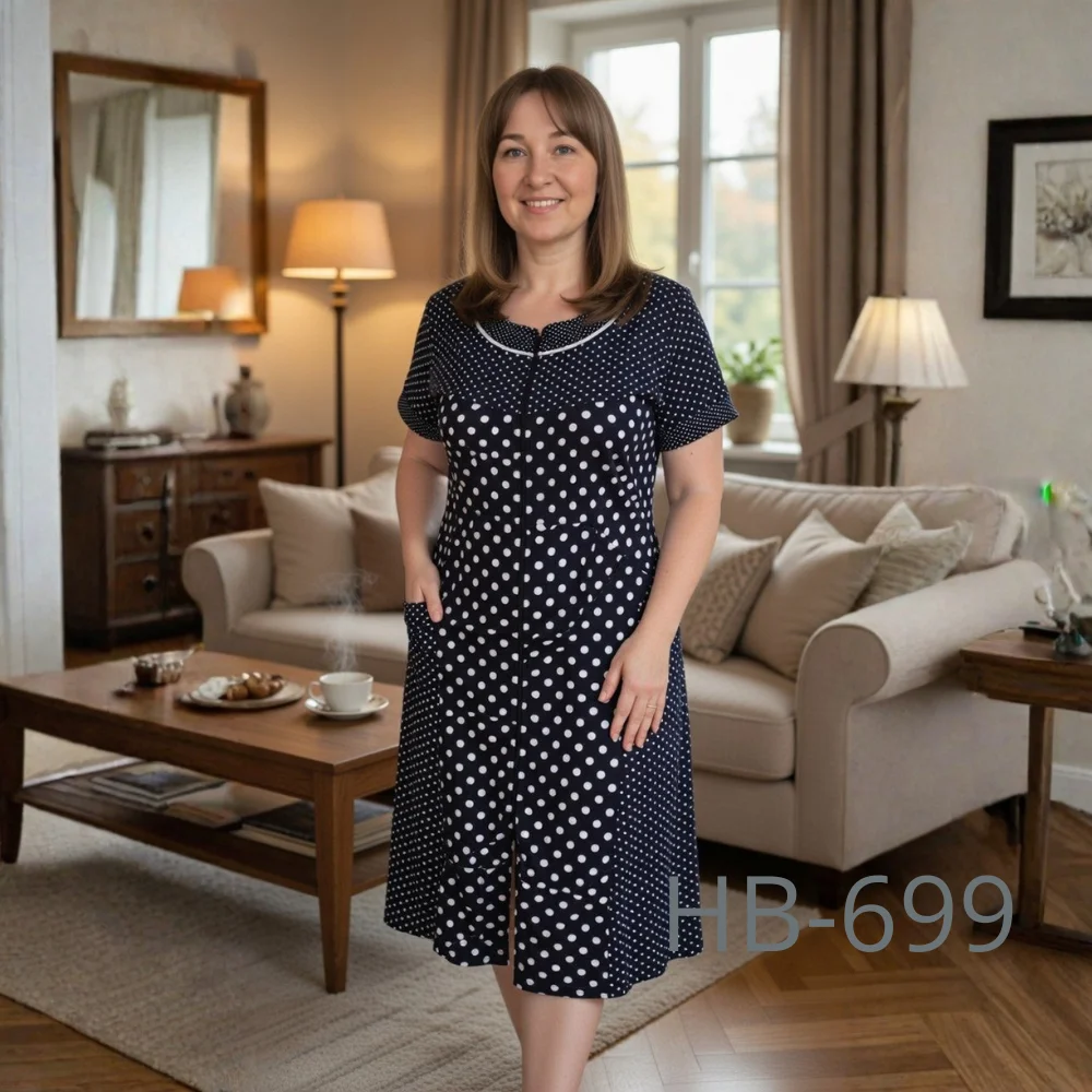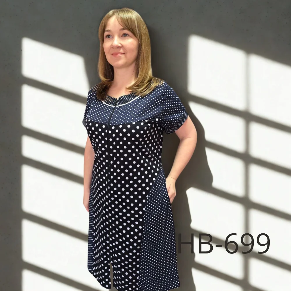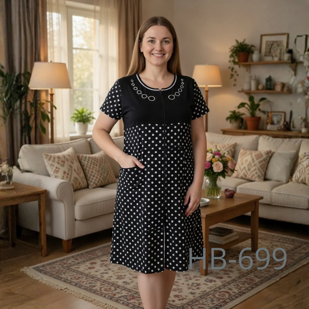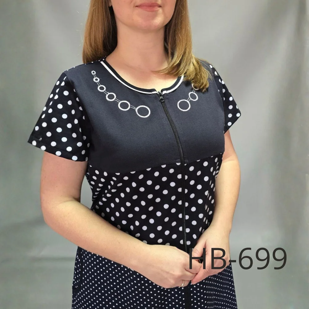 Халат має зручну застібку на блискавці по всій довжині, що робить його практичним у повсякденному використанні. Короткий рукав забезпечує комфорт у теплу пору року, а вільний крій не сковує рухів. Дві функціональні кишені додають зручності, дозволяючи зберігати дрібні речі під рукою.