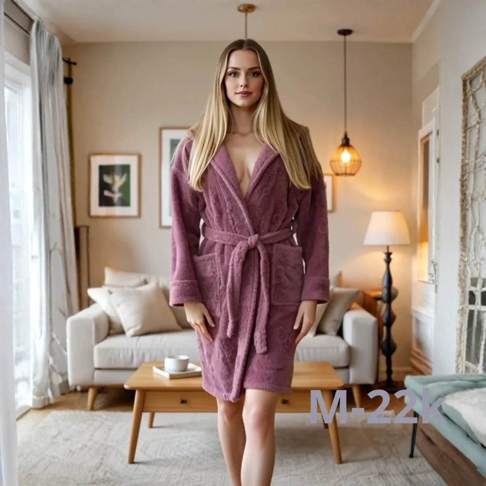 Жіночий халат Cozy Embrace — це втілення домашньої ніжності та розкоші, створене для тих, хто цінує комфорт у кожній деталі. Виготовлений з високоякісної турецької махри, цей халат дарує неперевершене відчуття м’якості, тепла і затишку.
