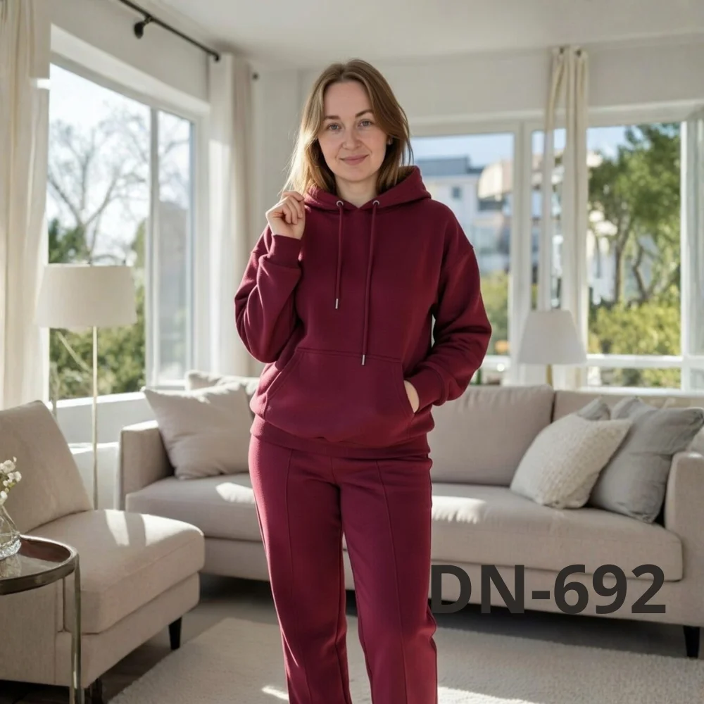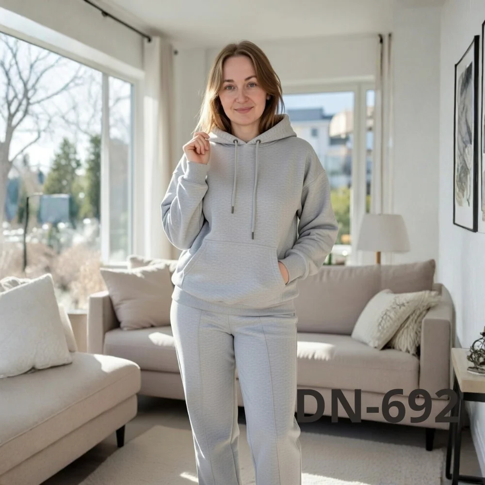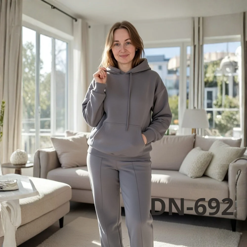 Костюм складається з худі з капюшоном і зручними кишенями та штанів прямого крою. Такий фасон підходить як для домашнього відпочинку, так і для повсякденних виходів — прогулянок, поїздок або активного дня. Трикотаж добре пропускає повітря, не парить і при цьому зберігає тепло.