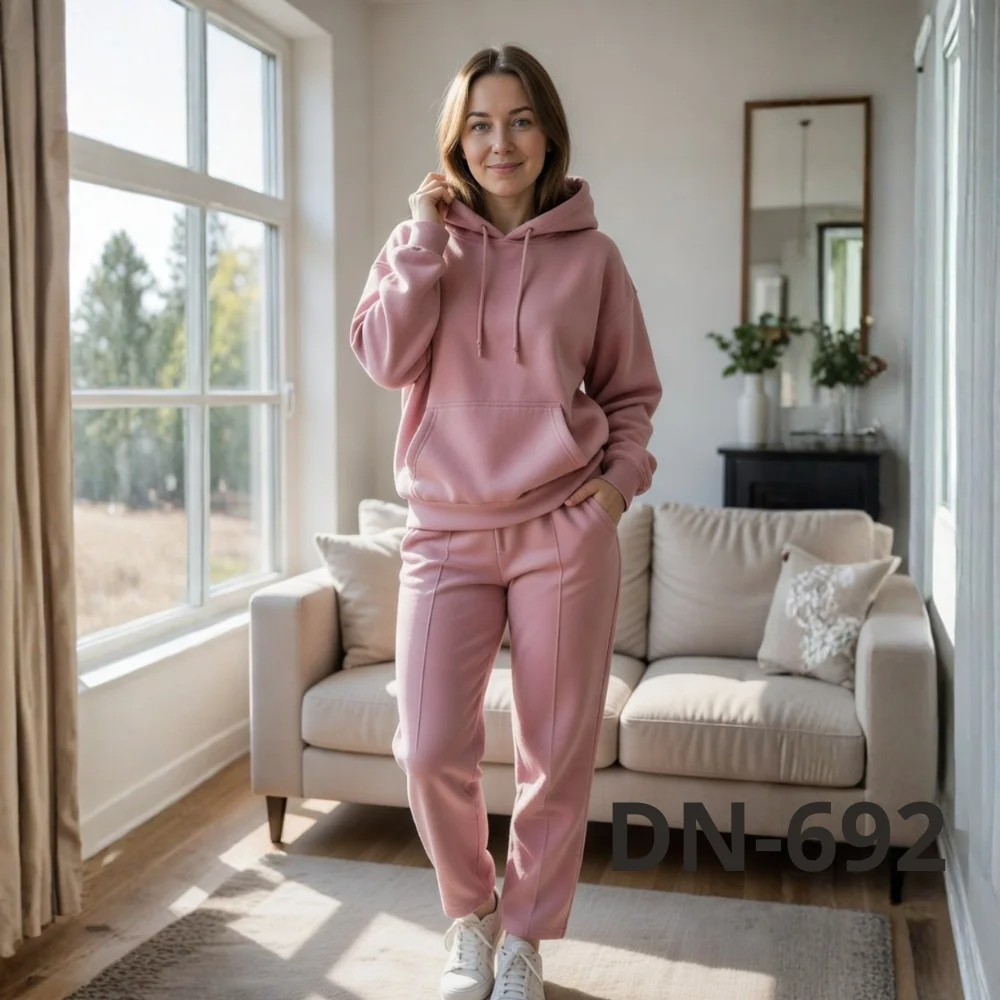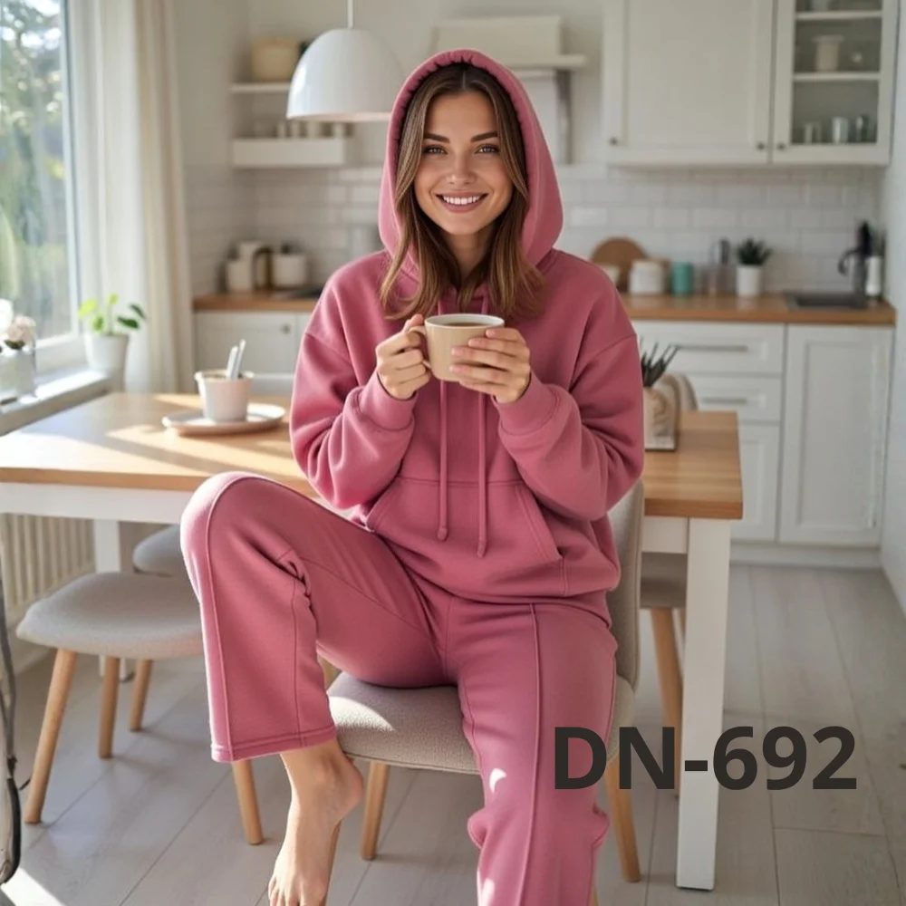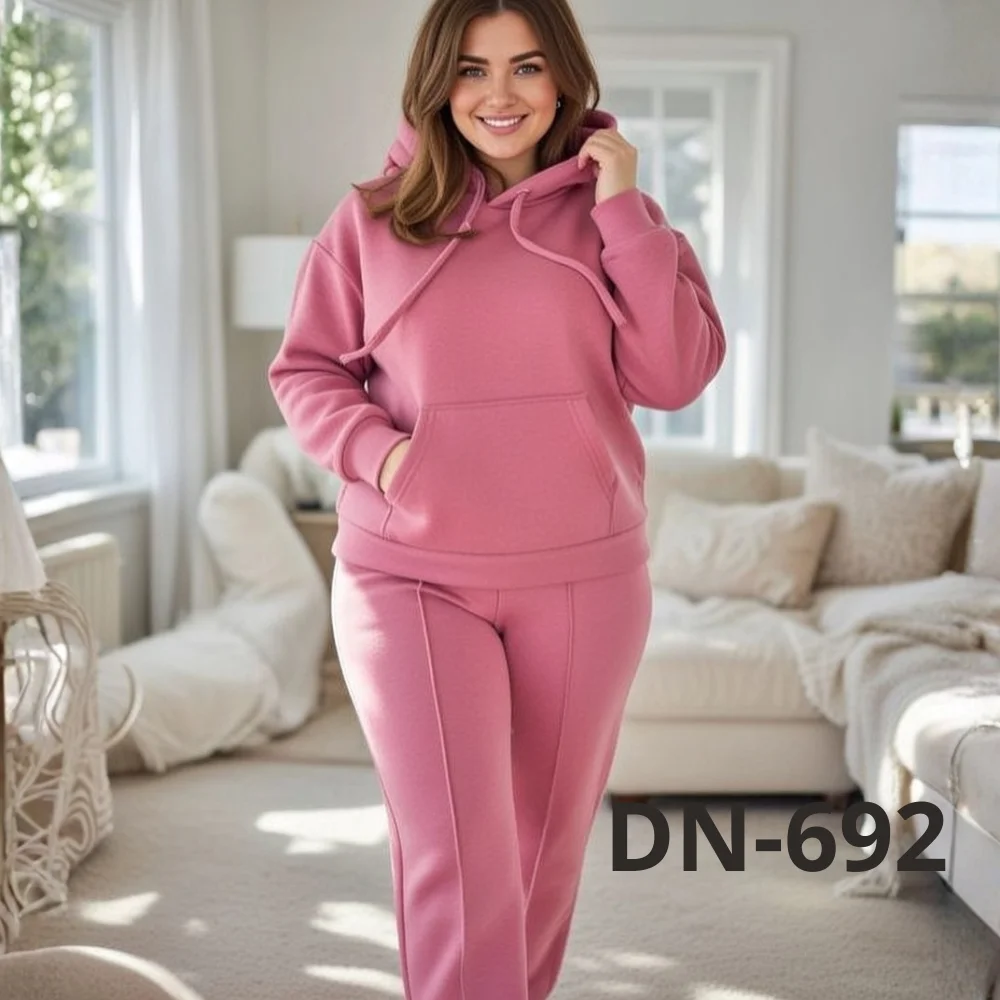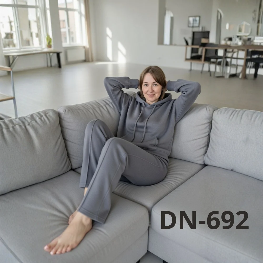 Костюм складається з худі з капюшоном і зручними кишенями та штанів прямого крою. Такий фасон підходить як для домашнього відпочинку, так і для повсякденних виходів — прогулянок, поїздок або активного дня. Трикотаж добре пропускає повітря, не парить і при цьому зберігає тепло.