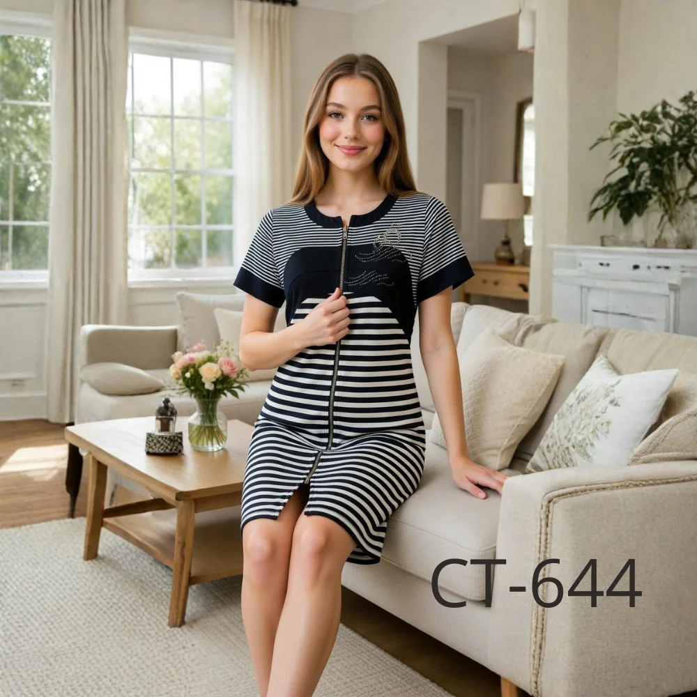 Дизайн моделі підкреслює жіночність і гармонійно поєднує короткі рукави, відрізну кокетку по грудях і зручні бічні кишені. Халат застібається на блискавку, що робить його ще зручнішим у повсякденному носінні.
