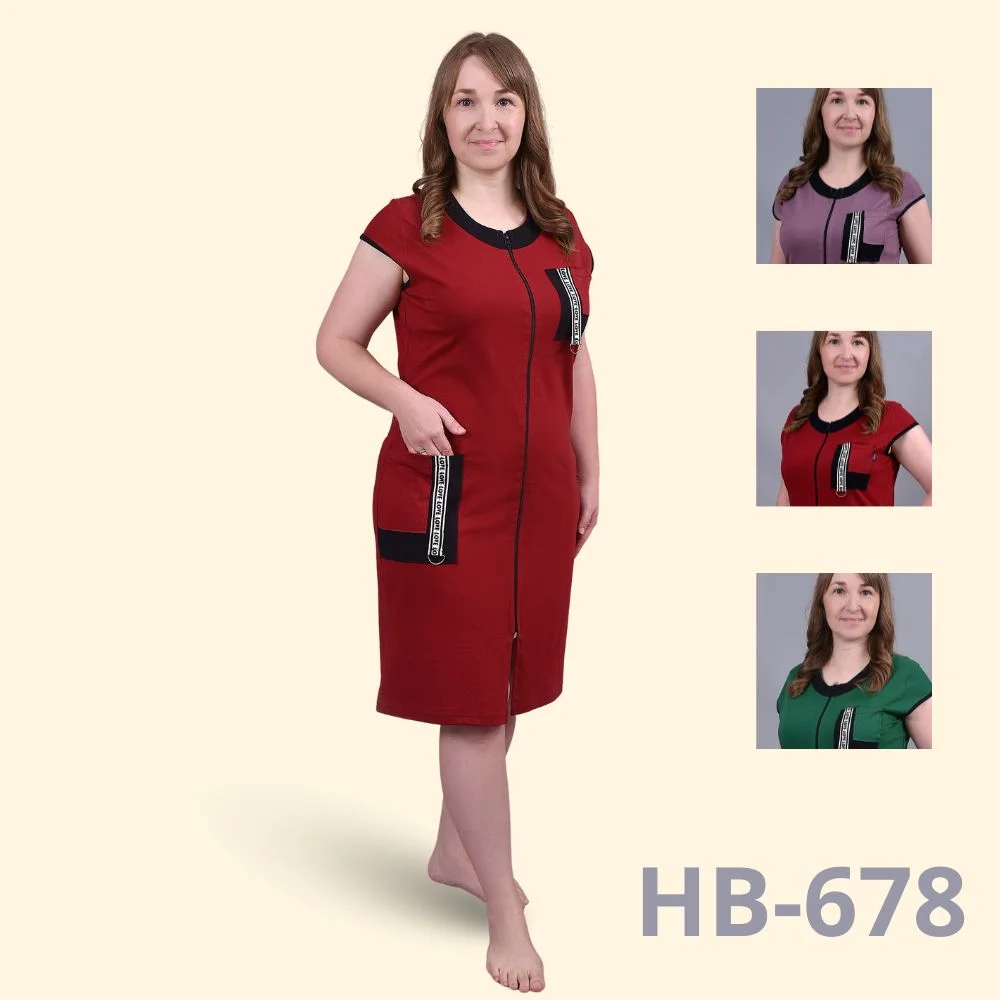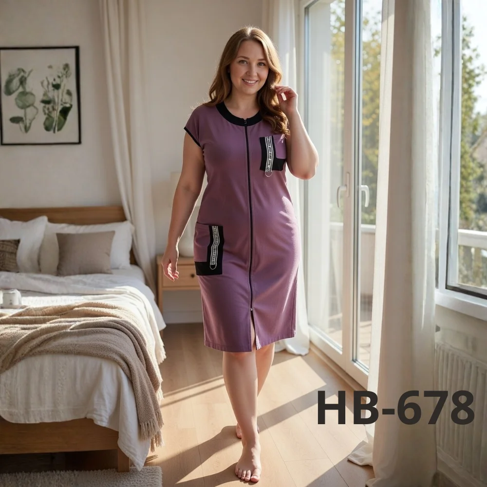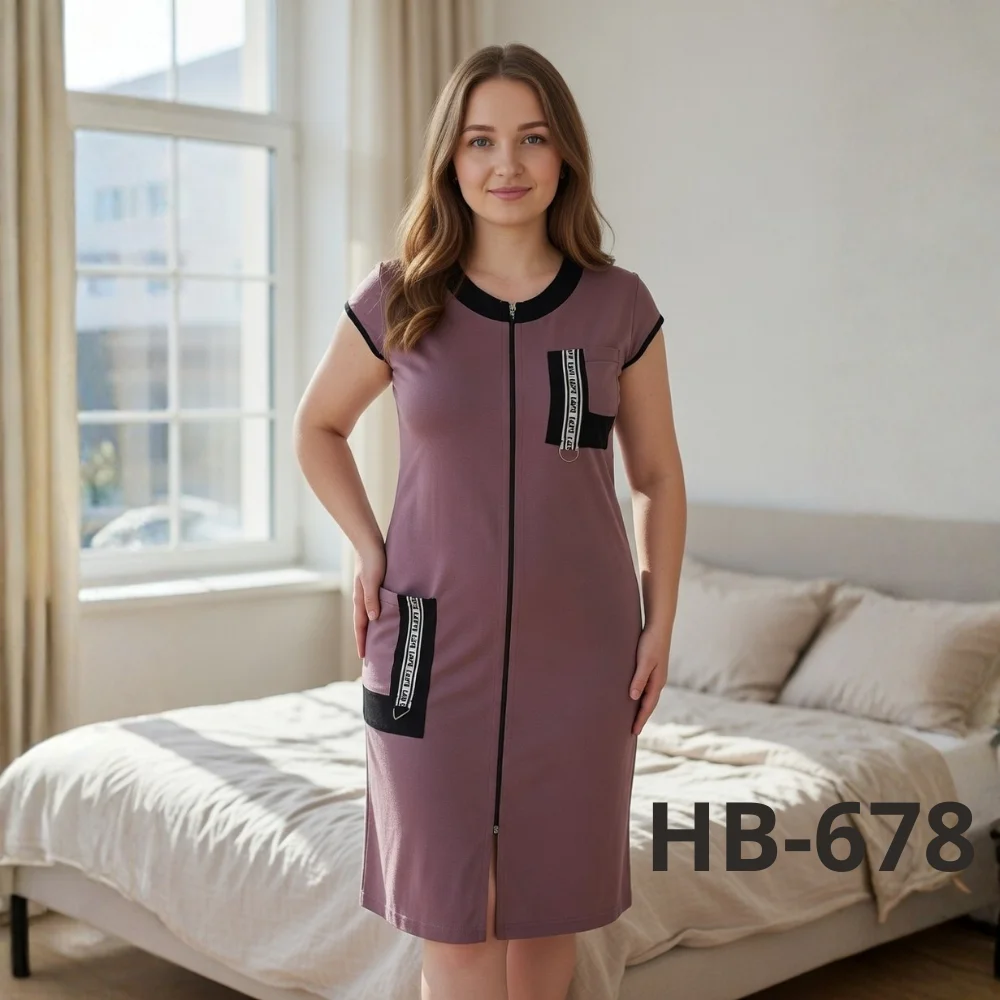 Модель представлена у трьох стильних кольорах — пудра, бордо та зелений. Контрастні деталі чорного кольору додають акценту й сучасного вигляду. На грудях та кишені розміщено декоративні стрічки з написом, що надають моделі актуальності та молодіжного стилю. Центральна застібка на блискавку забезпечує зручність у щоденному використанні, а дві глибокі кишені роблять халат ще практичнішим.