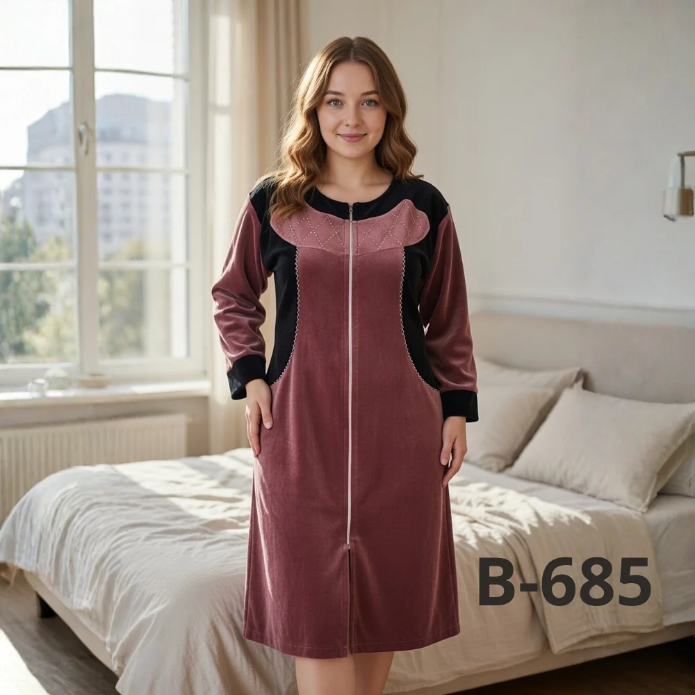 Модель вирізняється продуманим кроєм, що забезпечує ідеальну посадку на фігурі. Застібка-блискавка дозволяє легко одягати халат і надає сучасного вигляду. Практичні кишені додають зручності у повсякденному використанні. Цей халат чудово підходить для домашнього відпочинку, ранкових або вечірніх рутин та створює відчуття затишку.