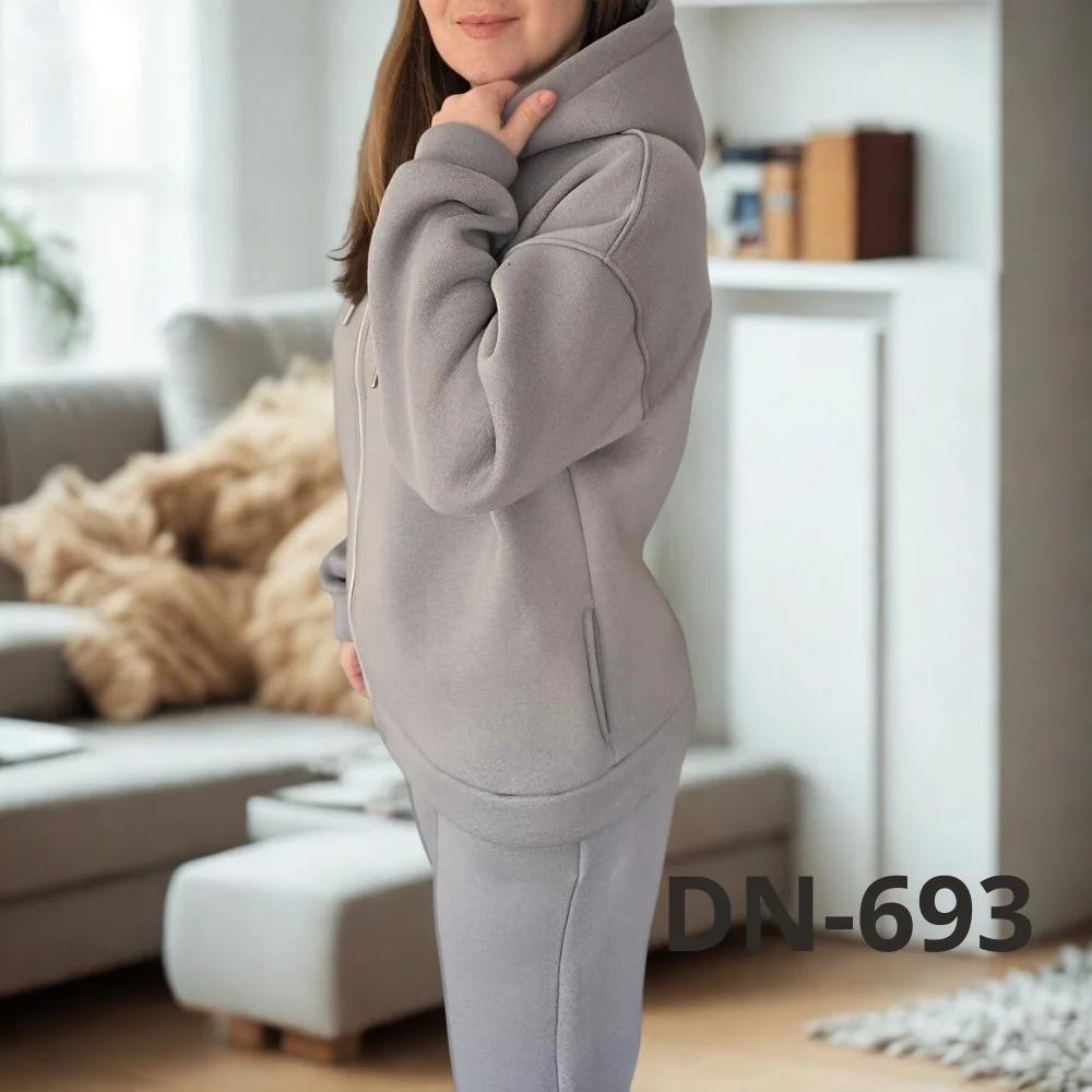 Костюм складається з худі з капюшоном на блискавці і зручними кишенями та штанів прямого крою. Такий фасон підходить як для домашнього відпочинку, так і для повсякденних виходів — прогулянок, поїздок або активного дня. Трикотаж добре пропускає повітря, не парить і при цьому зберігає тепло.