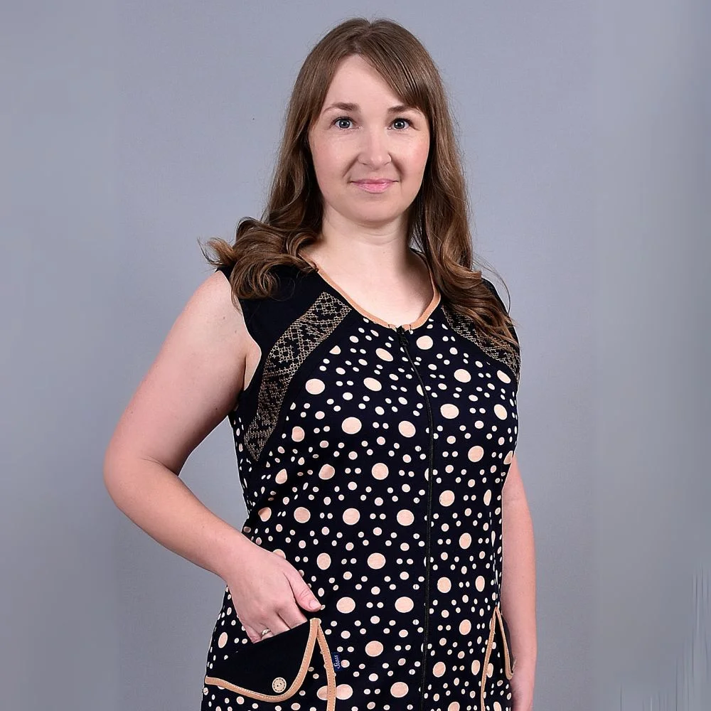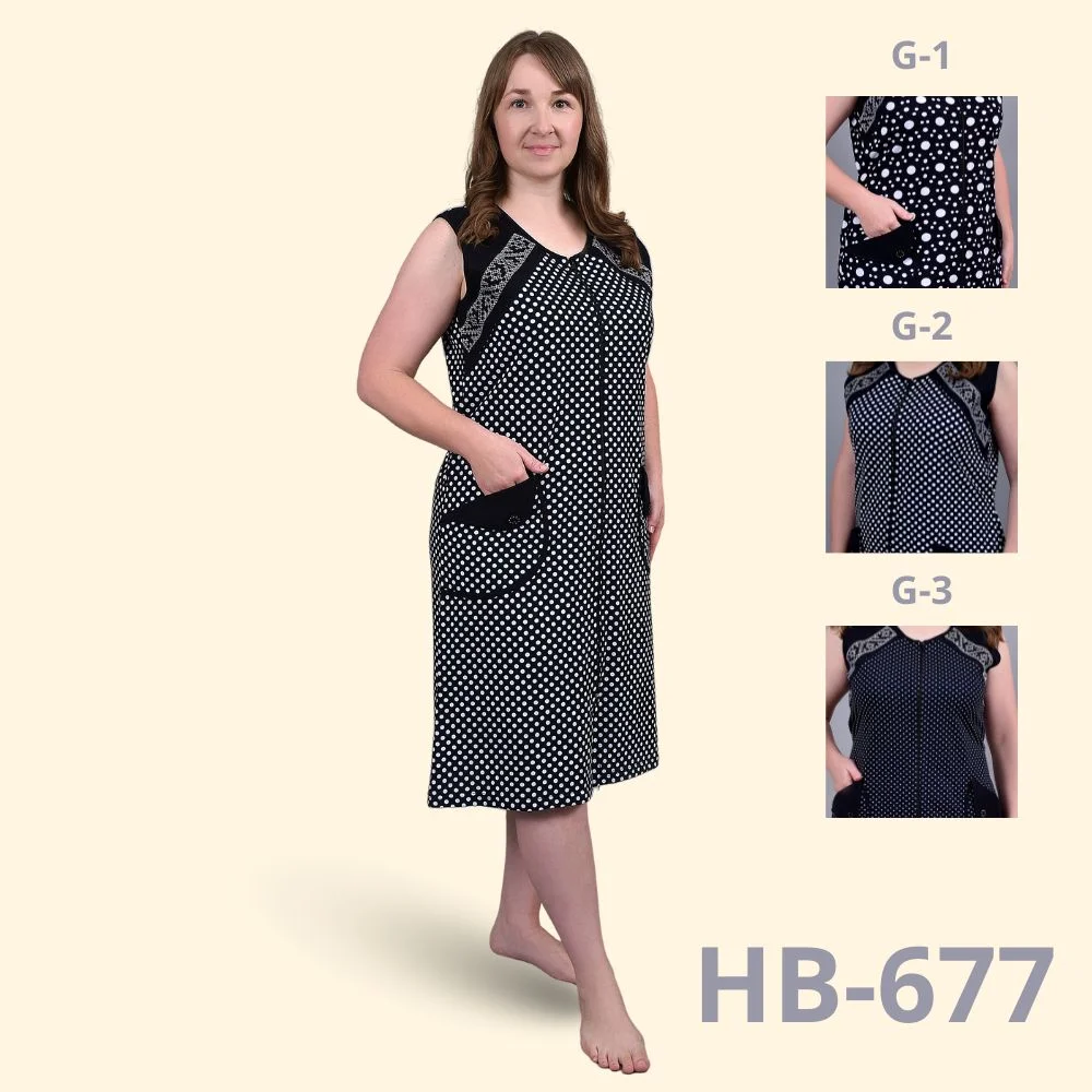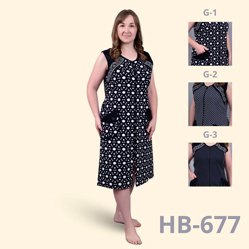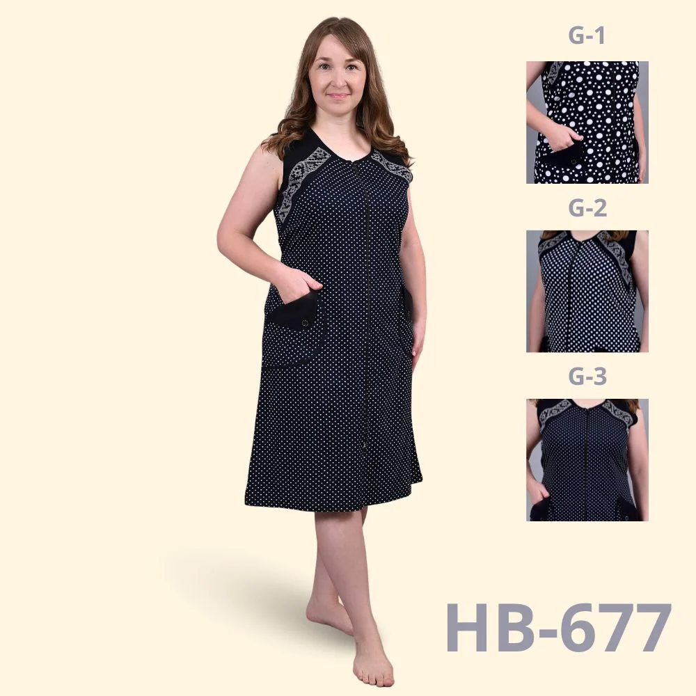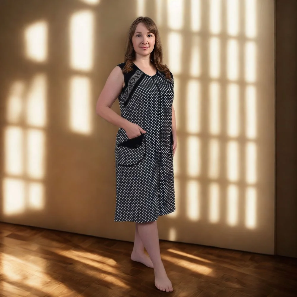 Дизайн виконаний у темно-синій гамі з чотирма варіантами принтів: великі та дрібні крапки, витончені візерунки або поєднання декоративної строчки з класичним горошком. Безрукавний фасон ідеально підходить для теплої пори року або для носіння вдома. Халат має зручну центральну застібку-блискавку та дві місткі кишені, що додають йому практичності.