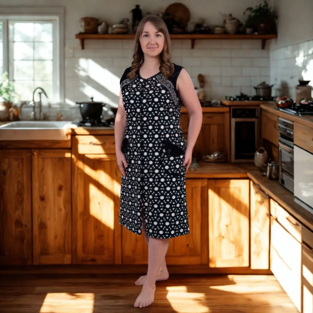 Матеріал не подразнює шкіру, ідеально підходить для чутливих людей, легко переться і швидко сохне. Крій продуманий таким чином, щоб не обмежувати рухів і водночас залишати фігуру жіночною. Це універсальна модель для щоденного використання — чи то ви готуєте сніданок, приймаєте гостей удома чи відпочиваєте на дачі.